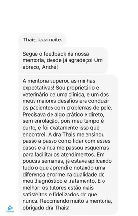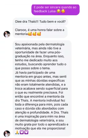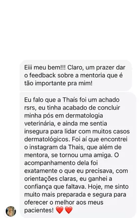 Meu propósito é compartilhar conhecimento de forma prática e embasada, ajudando colegas veterinários a se sentirem mais confiantes e preparados para os desafios da rotina dermatológica. Sei como pode ser desafiador conduzir casos dermatológicos, e foi justamente pensando nisso que desenvolvi essa mentoria: para oferecer suporte, direcionamento e encurtar o caminho do aprendizado, tornando a dermatologia mais acessível e aplicável no dia a dia clínico.